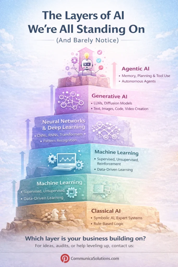A few weeks ago at CommunicaSolutions, one of our strategists shared this diagram in our team chat: a colorful stack of “Layers of AI” from Classical AI at the bottom all the way up to Agentic AI at the top. Neural networks, deep learning, generative models, autonomous agents each layer building on the one below like geological strata.